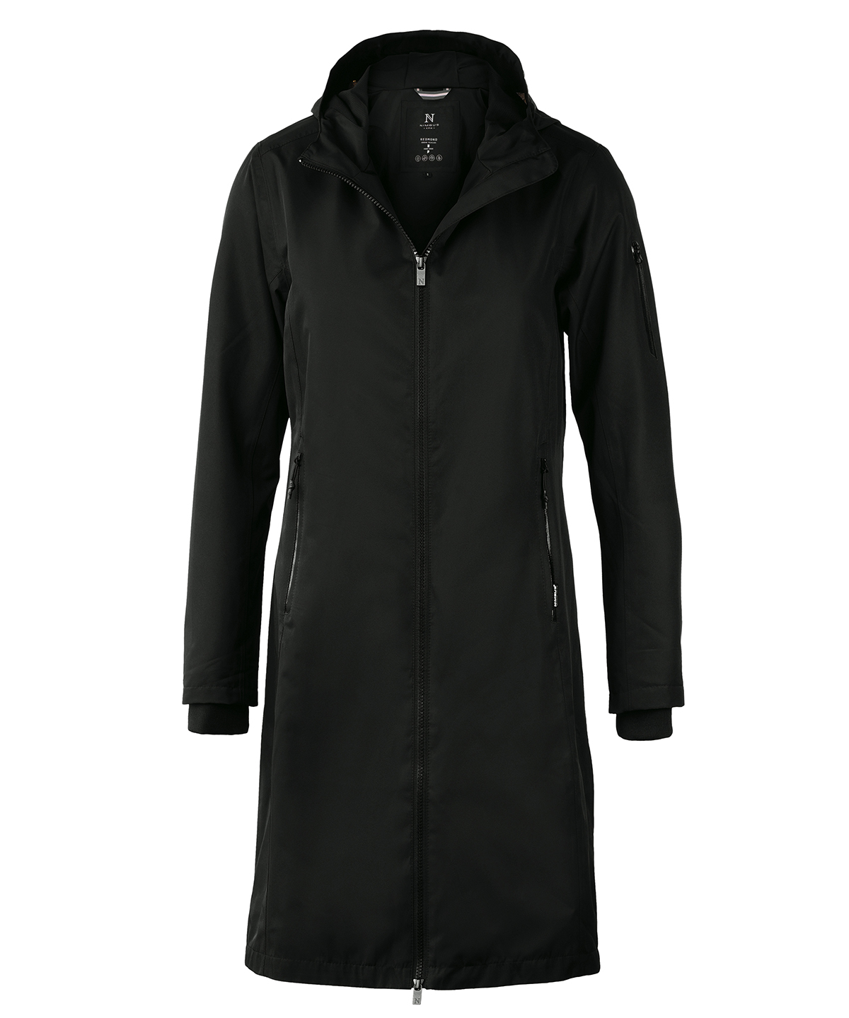 DETAILS: Windproof and waterproof with taped seams. Hood with drawstring. Feminine ¾ length. Water-repellent finish (Bionic Finish® ECO). Windproof. Water resistance: 3000mm. Breathability: 3000gsm/24h. Critically taped seams. SUSTAINABILITY: Reach. Global Compact. Amfori. Water-repellent – Bionic Finish® ECO