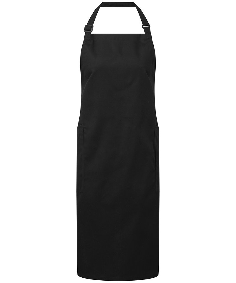 A heavyweight full length bib apron made from a combination of certified recycled polyester and certified organic Fairtrade cotton. Featuring two slanted side pockets and fully height adjustable with a buckle on the neckband. Two slanted side pockets measuring 24cm depth by 18cm wide. Adjustable buckle with gun metal finish. 86cm long x 72cm wide with 90cm long ties.