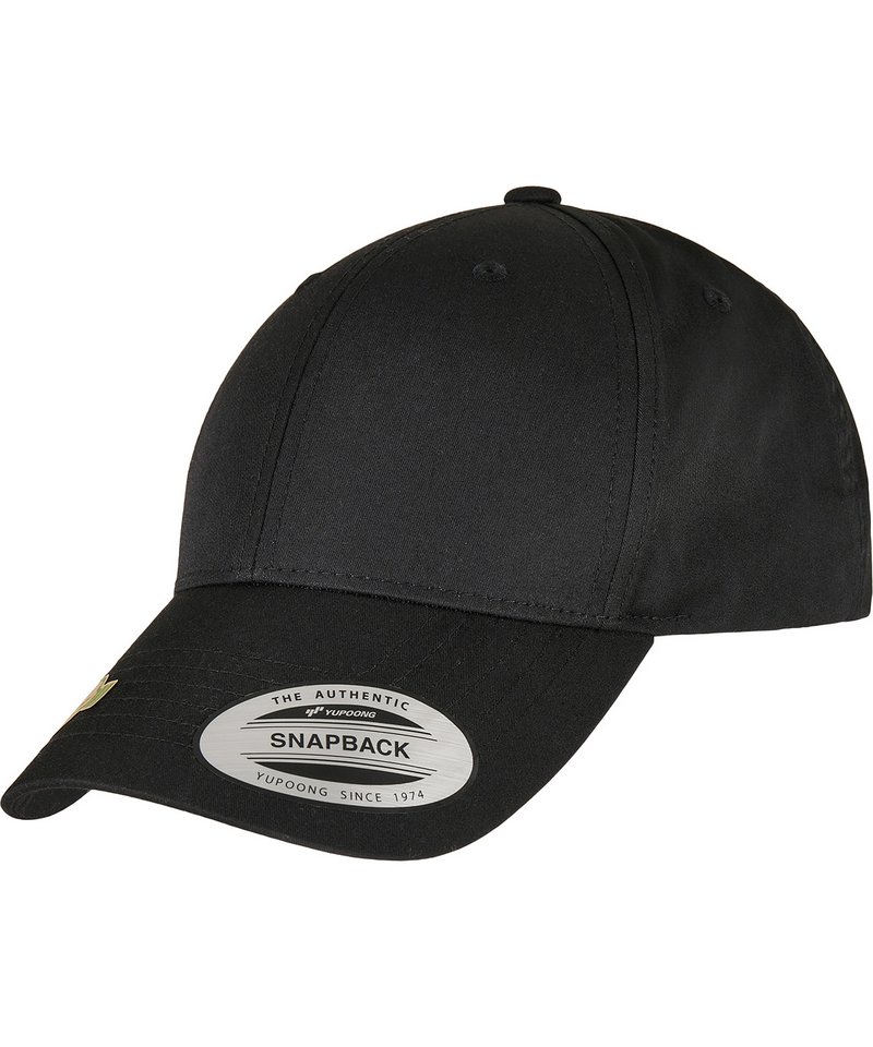 Snapback, curved visor, six-panel. Certified amfori BSCI, WRAP, Sedex and Global Recycled Standard.