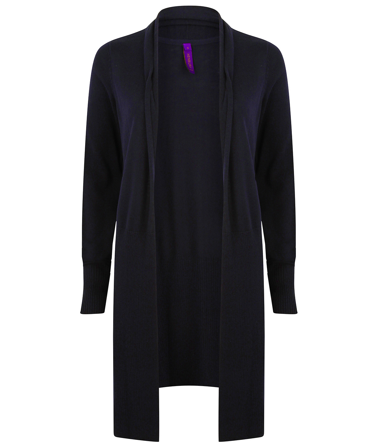 Fine knit, 12 gauge women’s long line loose cardigan. Half ribbing detail on body and sleeves. Semi-fashioned sleeve. Henbury cut-out brand label. Co-ordinates with HB720 product range. BSCI certified. Oeko-Tex certified. SEDEX certified.