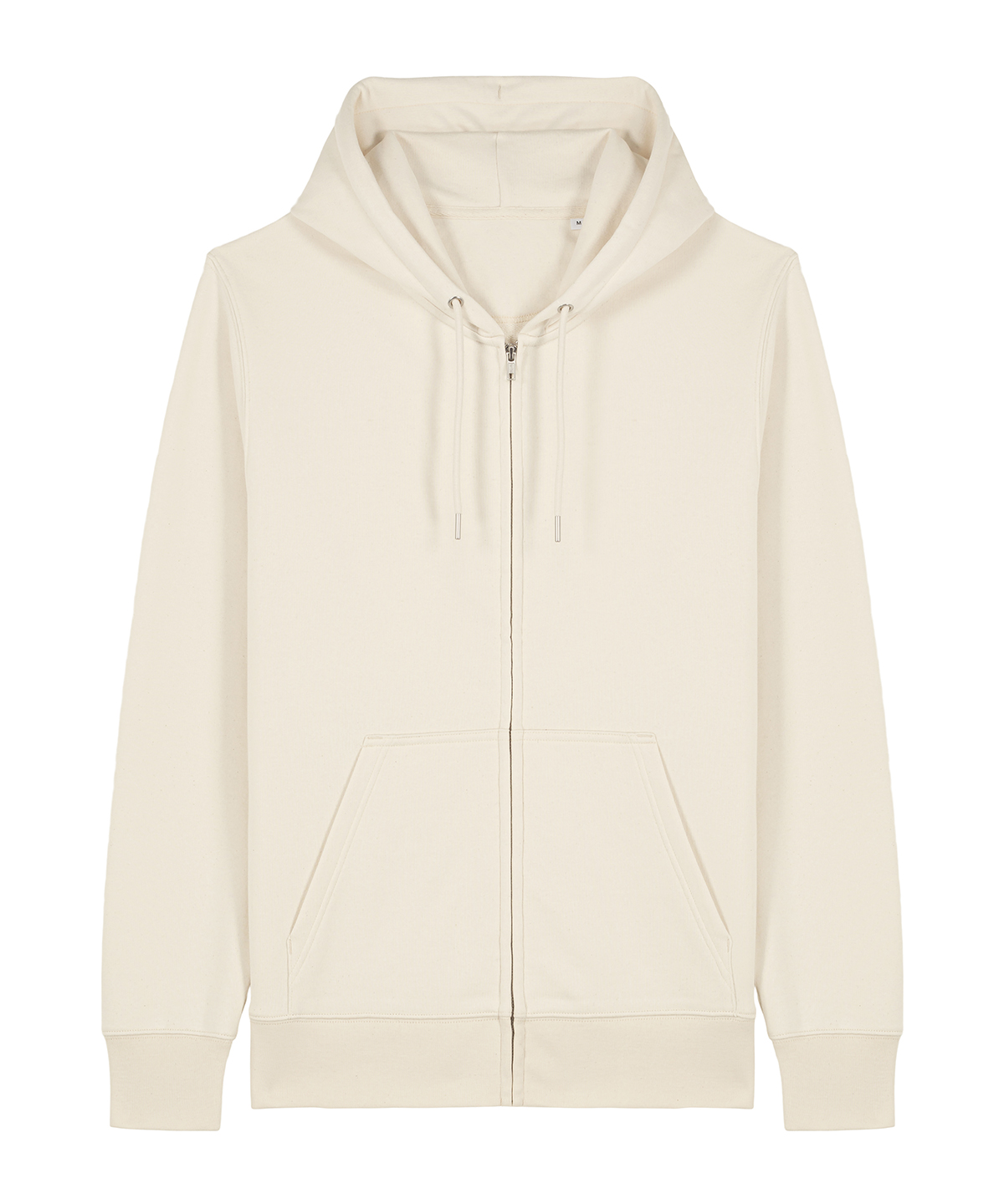 Set-in sleeves. Self-fabric lined hood. Covered metal zip at centre front. Round drawcords in matching body colour with closed metal tipping. Metal eyeletss. 1×1 rib at sleeve cuffs and bottom hem. Kangaroo pocket. Double-needle topstitches at the armhole, sleeve cuffs and bottom hem. Herringbone tape at the inside back neck seam and inside of the zip. Self-fabric half moon at back neck.