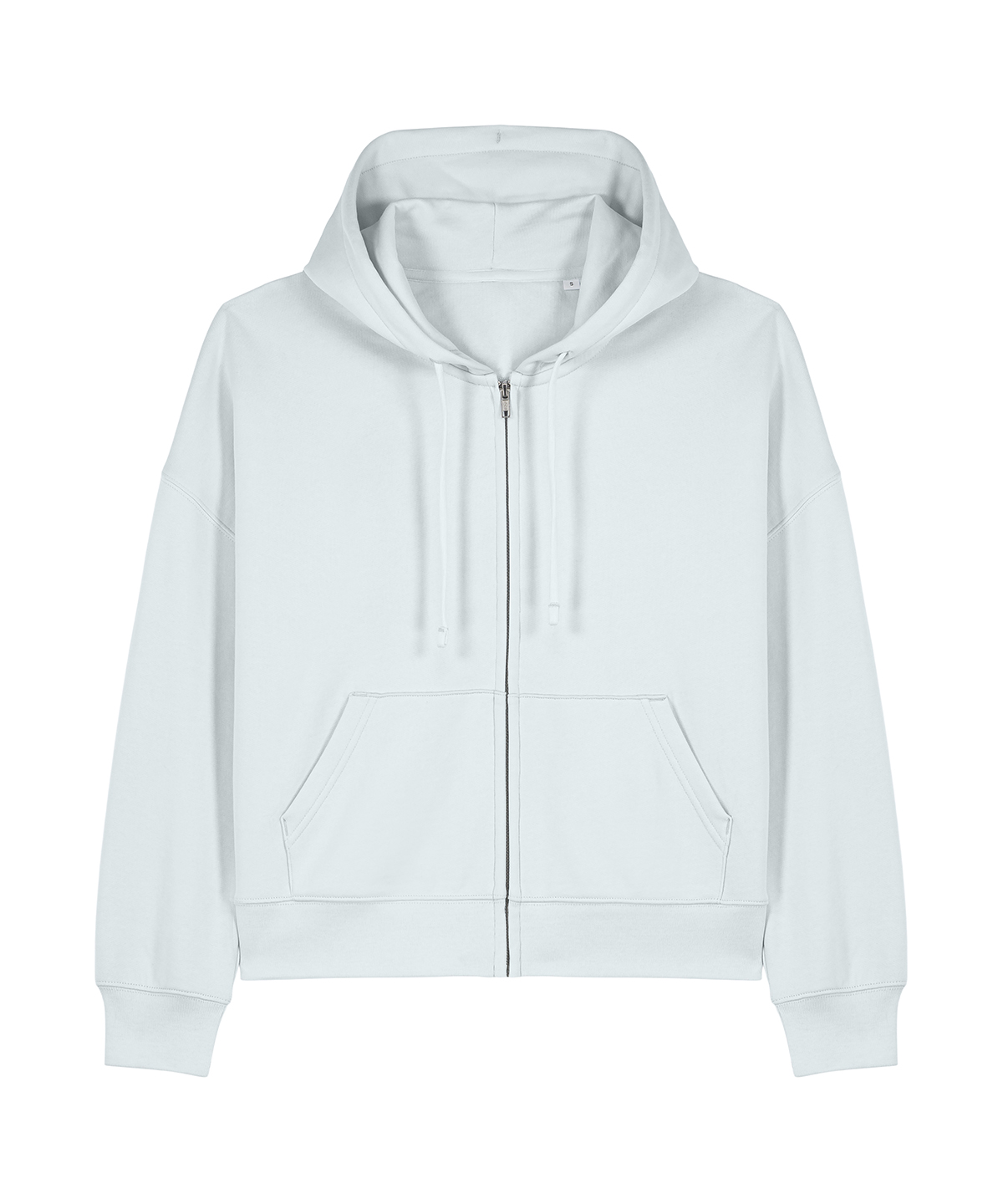 Set-in sleeves. Dropped shoulders. Double-layered hood in self-fabric. Flat drawcord in matching body colour. Embroidered eyelet. Covered metal zip at centre front. 1×1 ribs at sleeve cuffs and bottom hem. Two-needle topstitches on all seams. Inside grosgrain back neck tape. Self-fabric half moon at back neck.