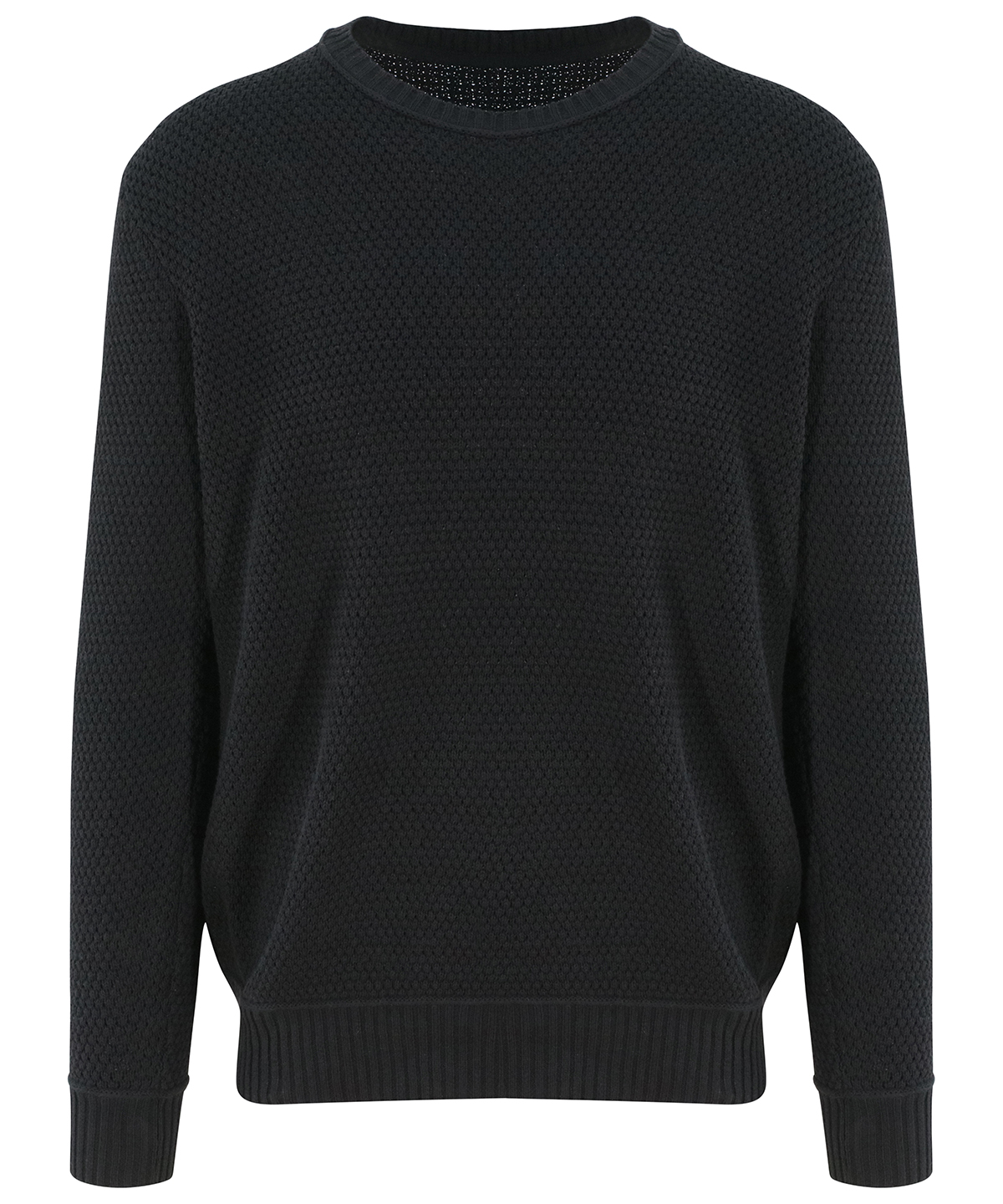Regenerated cotton blended with recycled polyester sweater. Seed stitch knit with rib neck, cuffs and hem.