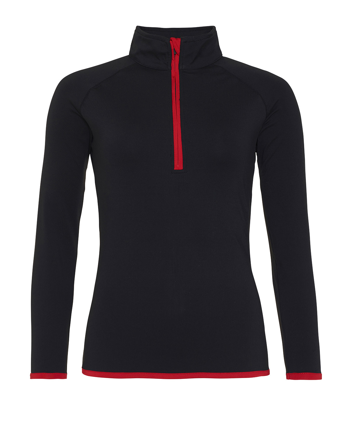 AWDis’ own CoolFit blended fabric containing elastane that provides stretch for comfort and a great fit, girlie fit, reflective tab at back of neck helps keep ear phone cords in place, self-fabric contrast colour binding at zip, cuffs and hem, raglan sleeve design creates ease of movement, 1/2 zip with stand-up collar for warmth, chin guard prevents irritation, simple tear off label makes it perfect for rebranding, UPF 30+ UV protection.
