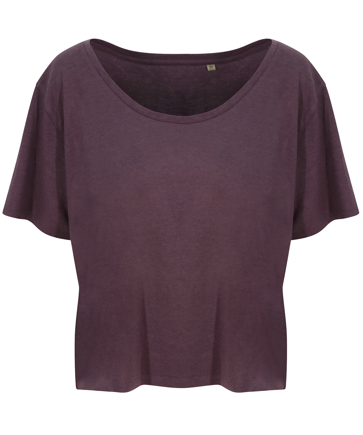 80% LENZING™ ECOVERO™, 20% organic Cotton. Single Jersey. Ribbed collar. Taped neck. Side seams – non tubular body. Twin-needle detail at hem and sleeve. Set-in sleeves. Wide crew neck. Crop length with dropped back. Size label only for easy rebranding.