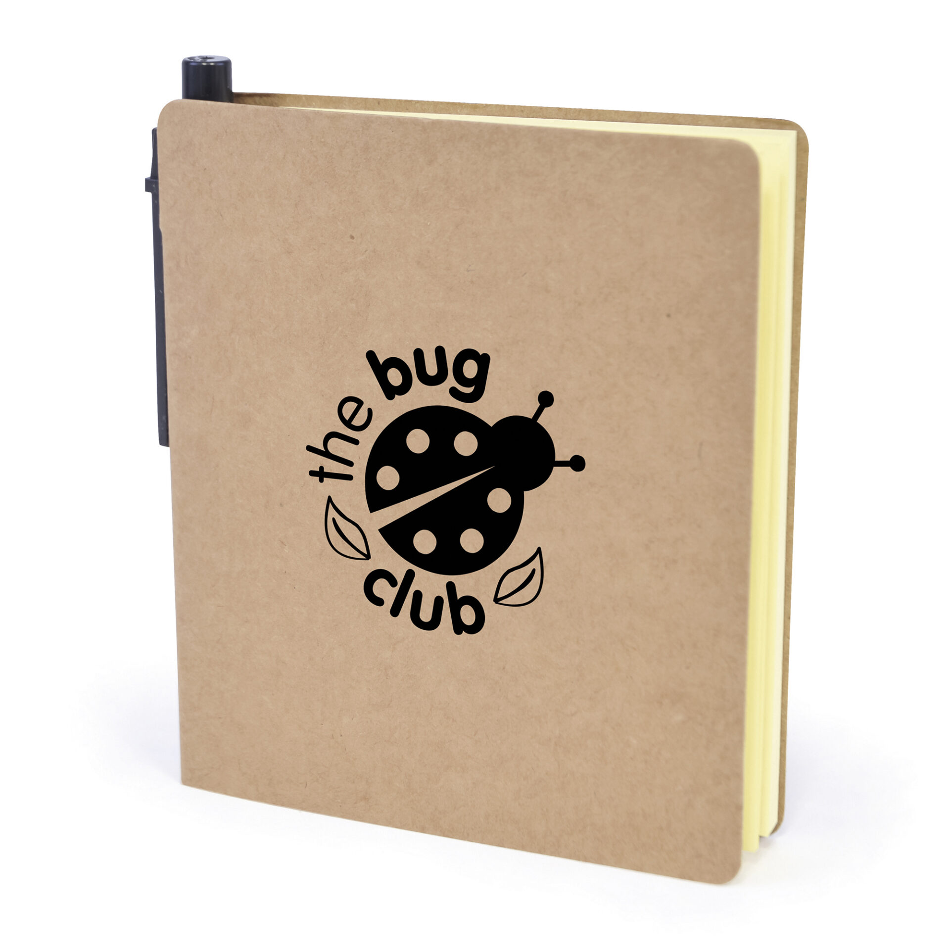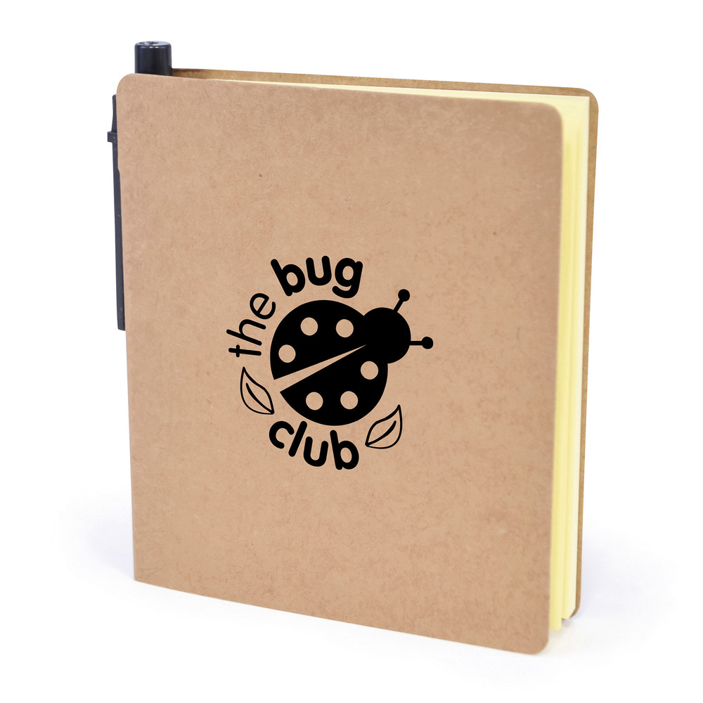 Plain paper notebook with a set of sticky notes, five sets of brightly coloured flags and a mini pen.