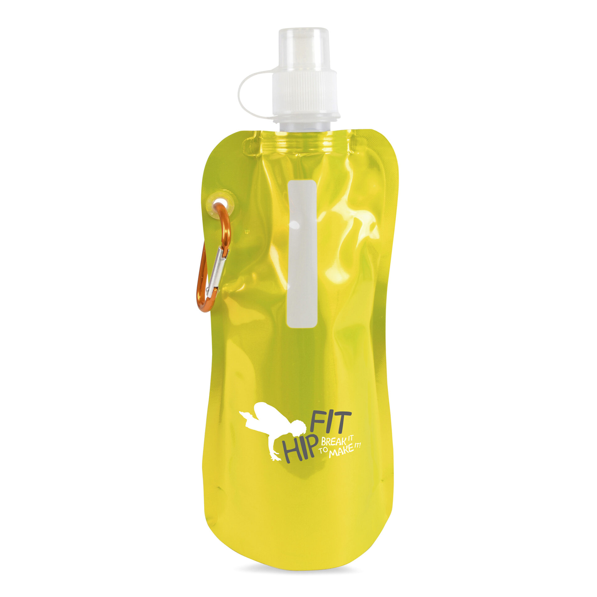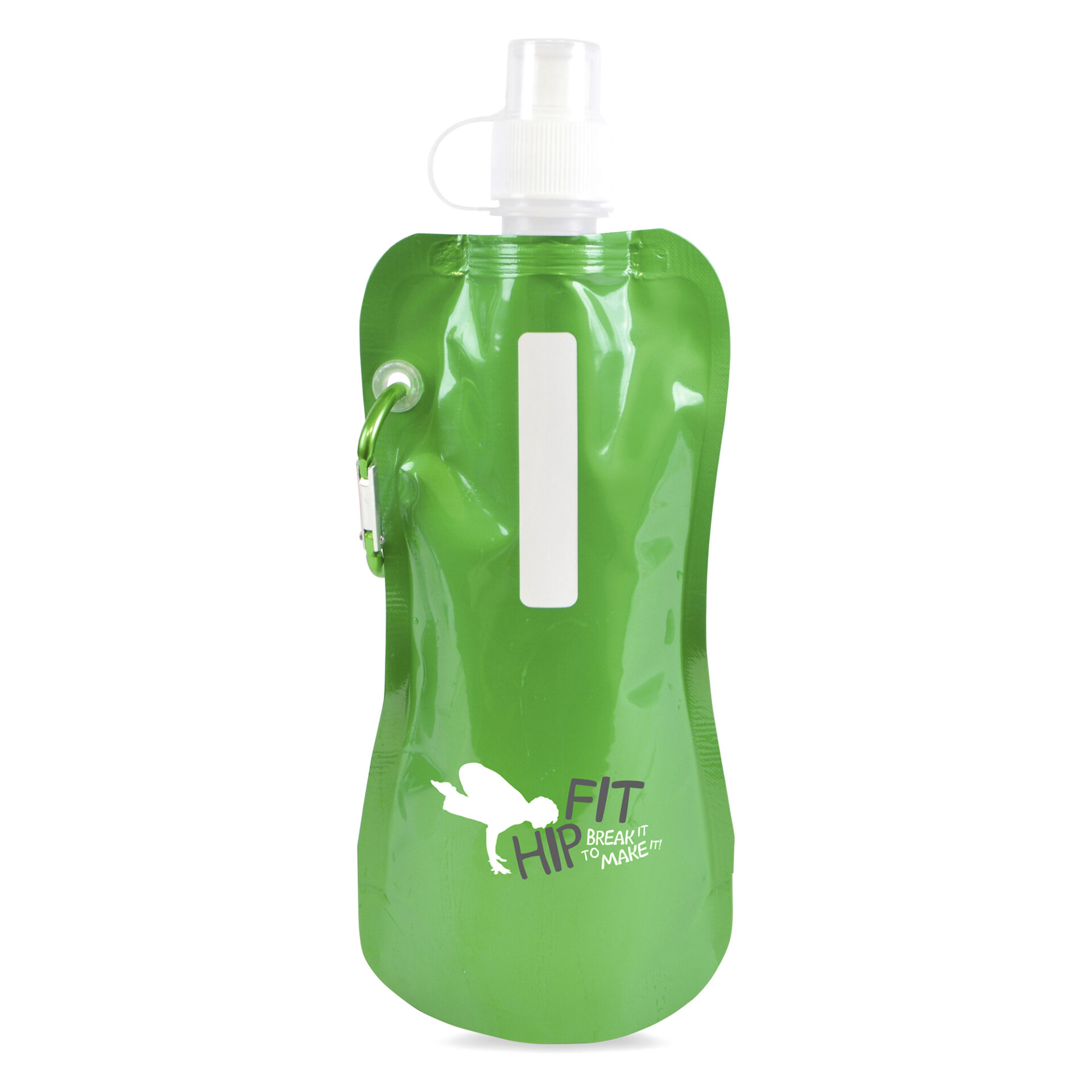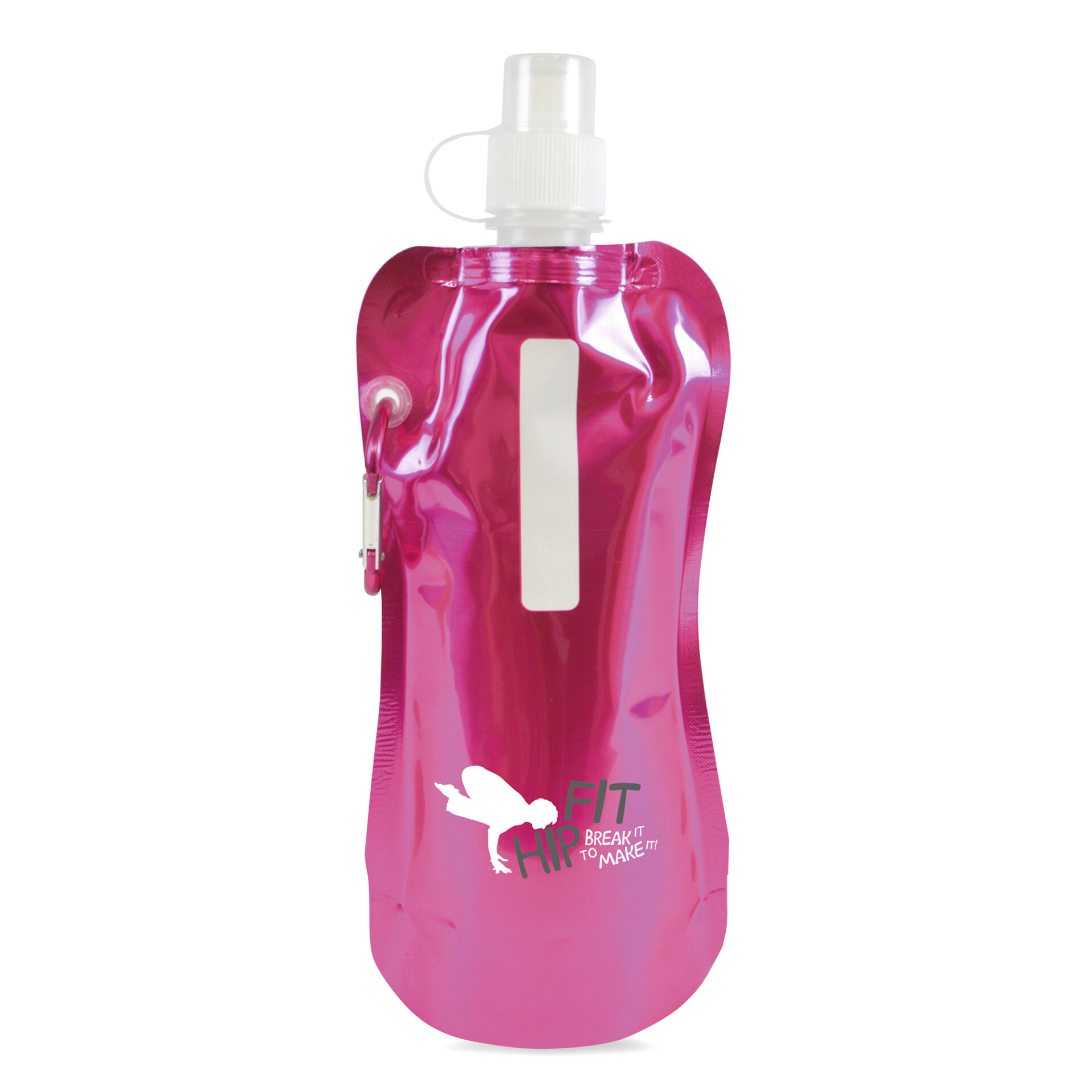 400ml metallic single walled mixed plastic (PA, PE and PET) and aluminium reusable roll up sports bottle with matching coloured carabiner. BPA & PVC free.