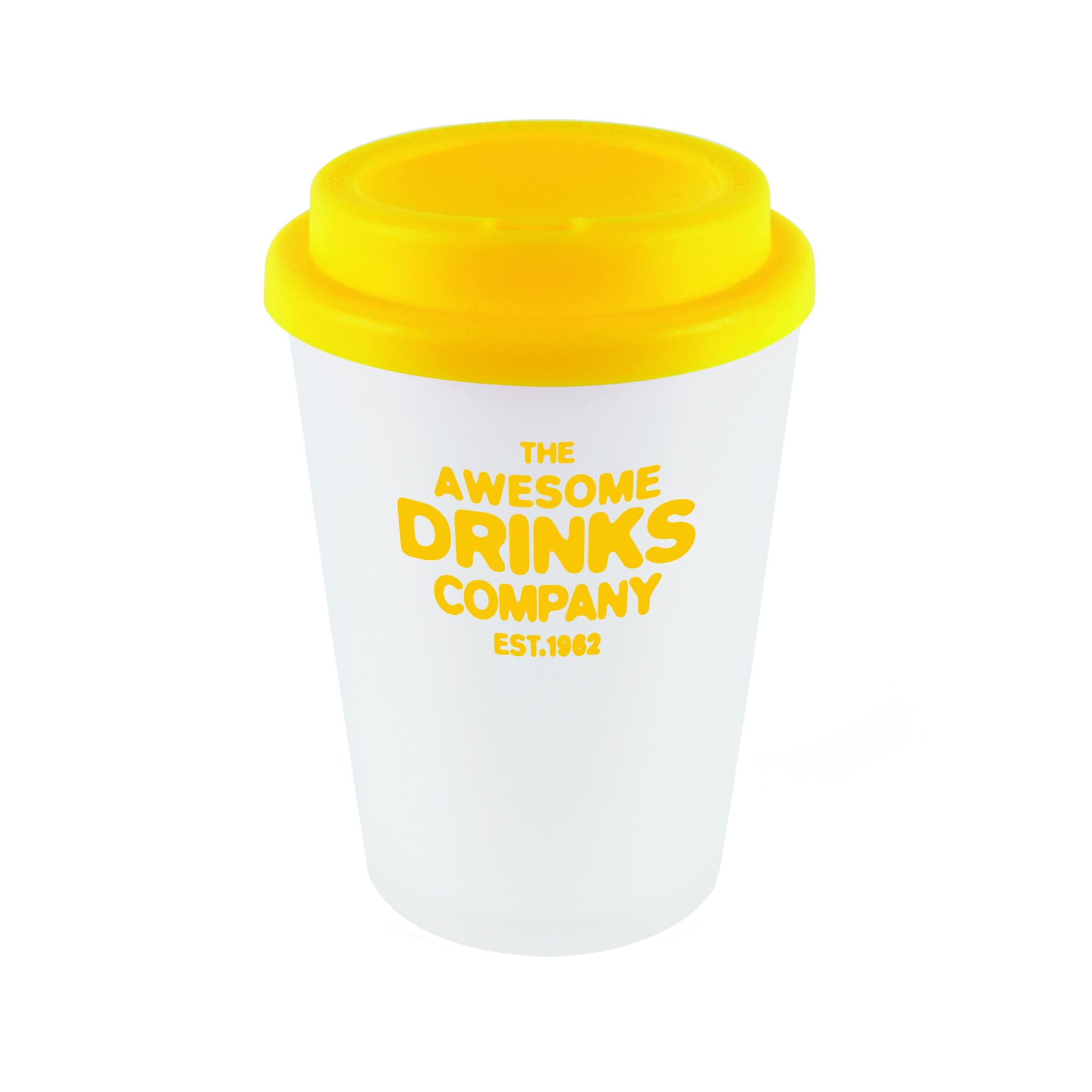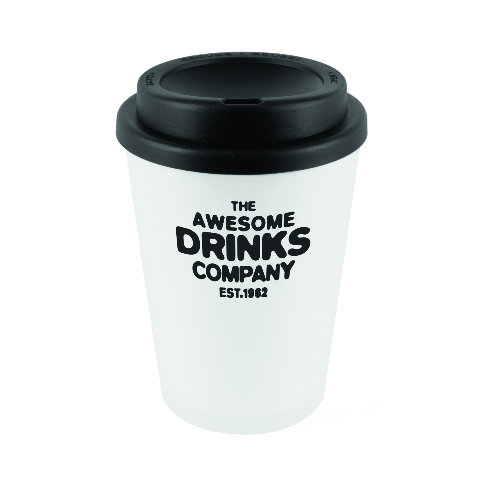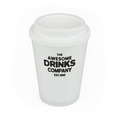 350ml double walled, PP plastic white frosted take out style coffee mug with coloured plastic screw top lid with sipper. BPA & PVC Free.
