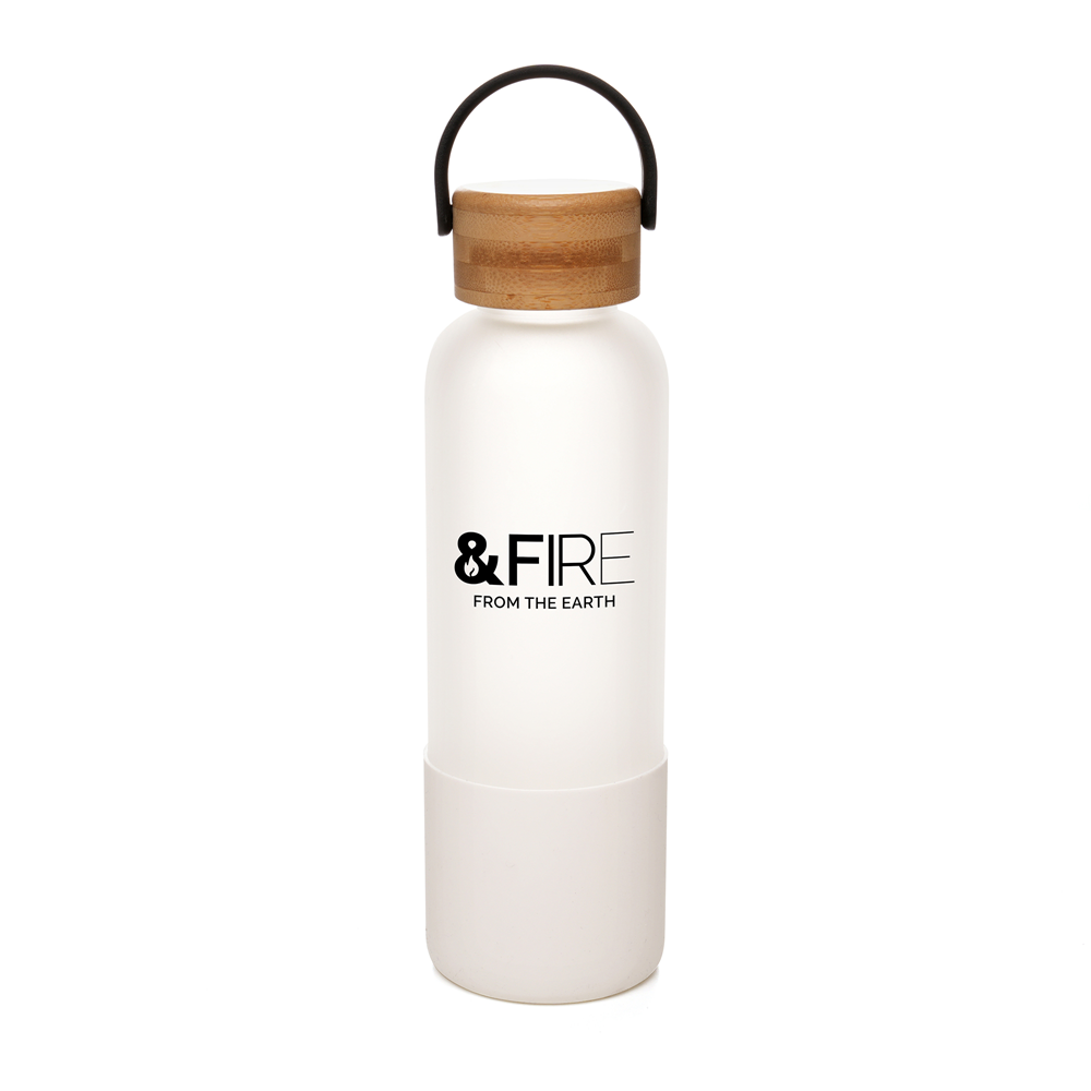 Introducing our Lunar glass and silicone bottle with a bamboo lid, carry handle, and silicone sleeve—perfect for making your brand stand out! Made from durable borosilicate glass, this bottle is more resistant to thermal shock and breakage compared to regular glass, ensuring long-lasting use. The silicone sleeve, covering the bottom half, provides extra grip and protection, while the natural bamboo lid adds a natural touch. This premium bottle is an excellent promotional item, offering ample space for branding to keep your logo front and centre. Ideal for giveaways at exhibitions, trade shows, or corporate events, it leaves a lasting impression on clients and customers. With its premium materials and sleek design, itÂ’s not just a useful hydration tool, but also a high-end promotional gift that reflects your brand’s quality and attention to detail.