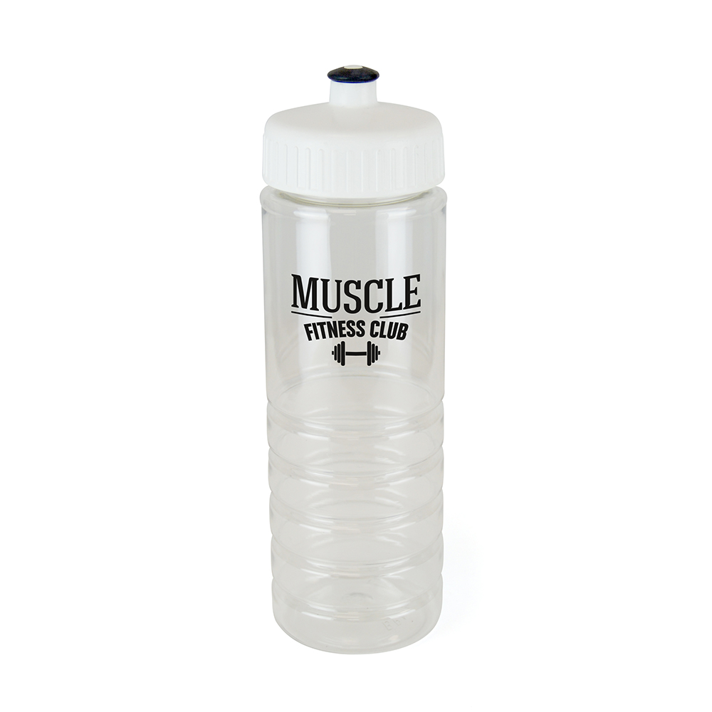 725ml single walled, translucent, PET plastic drinks bottle with secure coloured push/pull screw PP plastic lid with a black TPE sipper piece. BPA & PVC free.