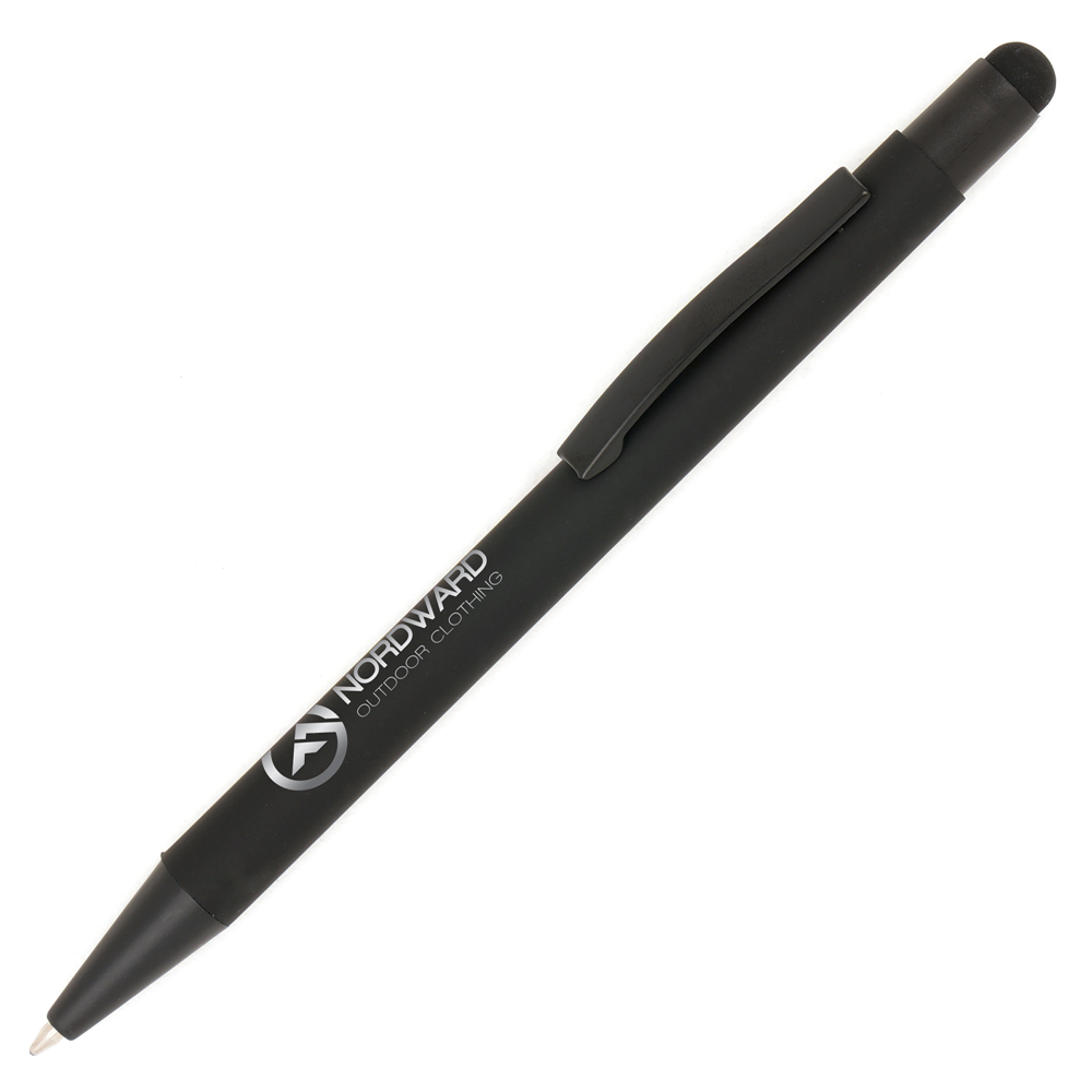 A soft-feel all black stylus pen with matching trim provides a super sleek look. A chrome undercoat provides a stylish engrave option. Gold under coat option also available (TPC580402)