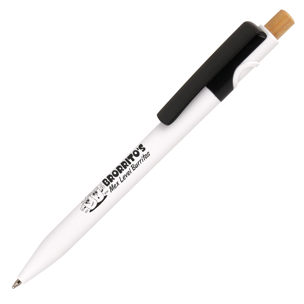 Promote your brand with this customisable ball pen made from ocean-bound, recycled plastic. Perfect for corporate merchandise, trade shows, exhibitions, and events, it features a sleek white barrel, colourful trim, and a distinctive plunger made from bamboo. The barrel of the pen boasts a generous branding area that can be printed with your company logo – ideal for advertising and brand merchandising. Recycled symbols pre-printed to the back of the pen. Order yours today!