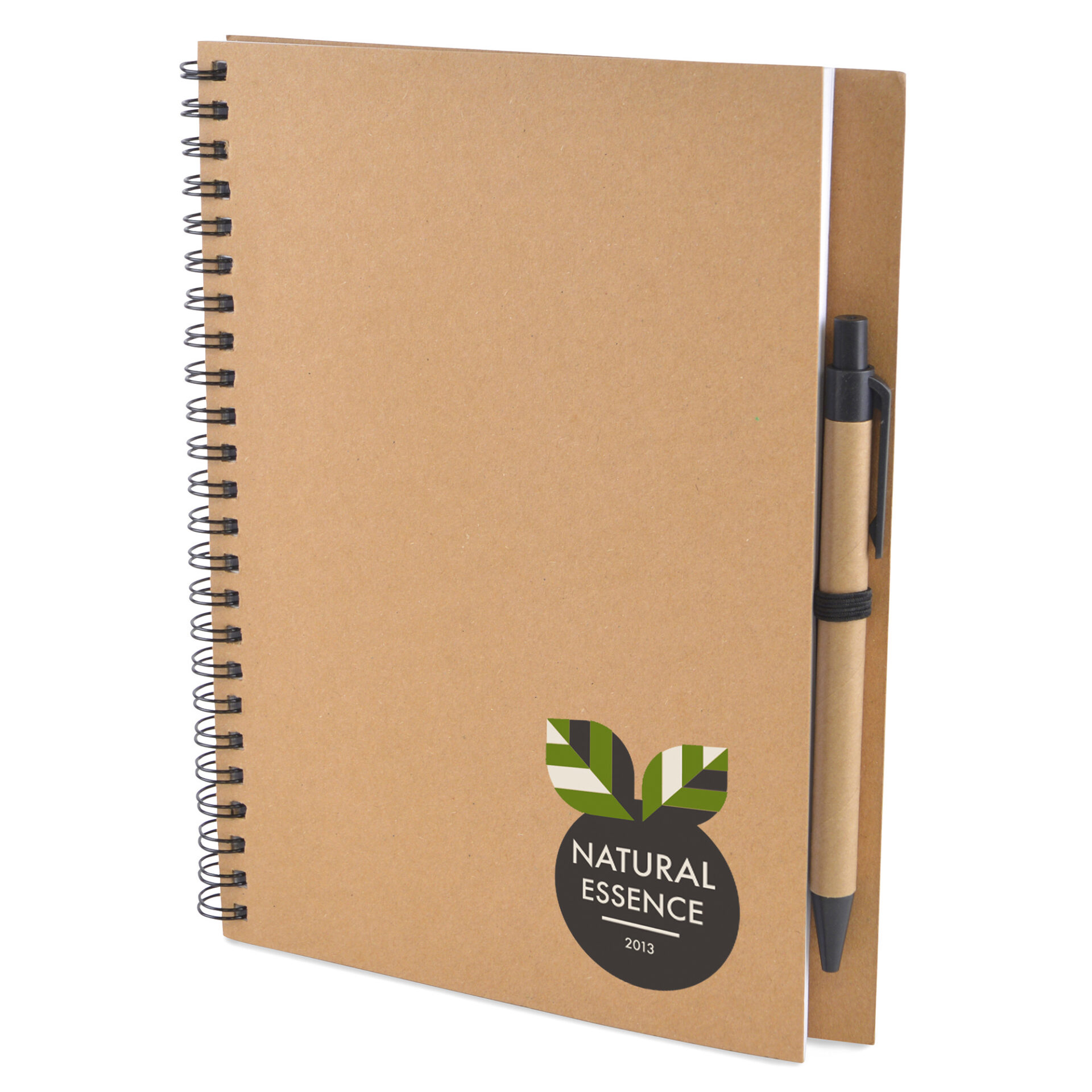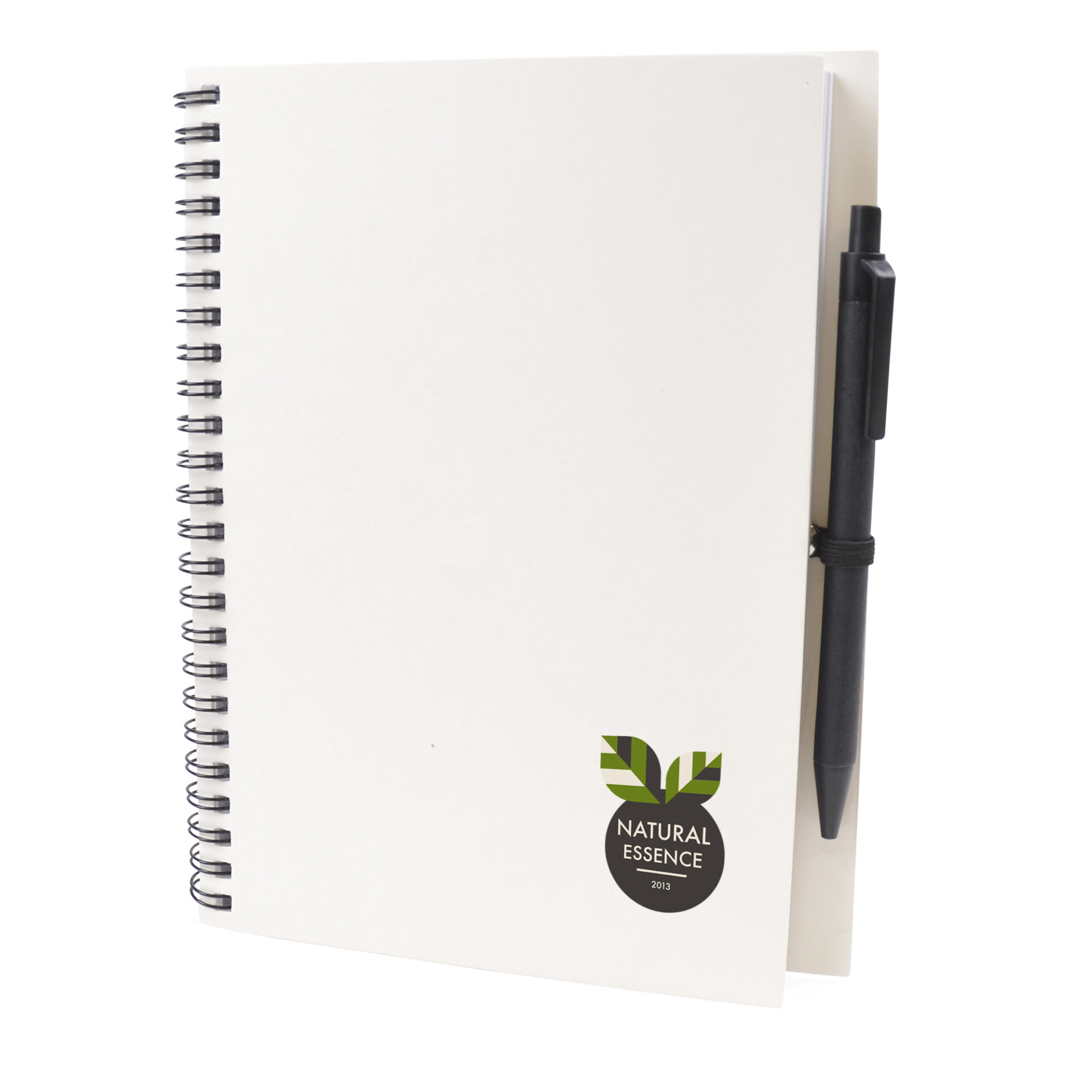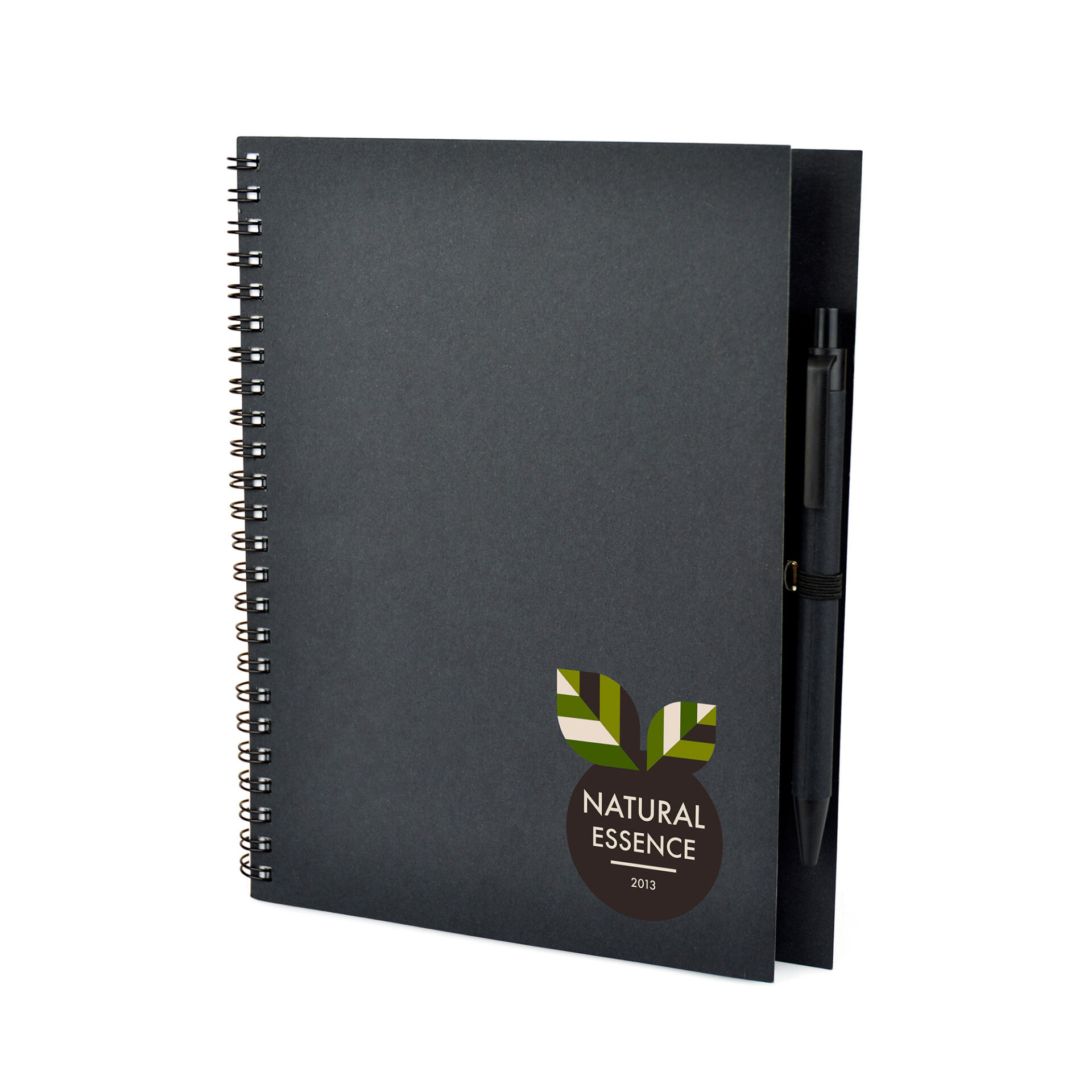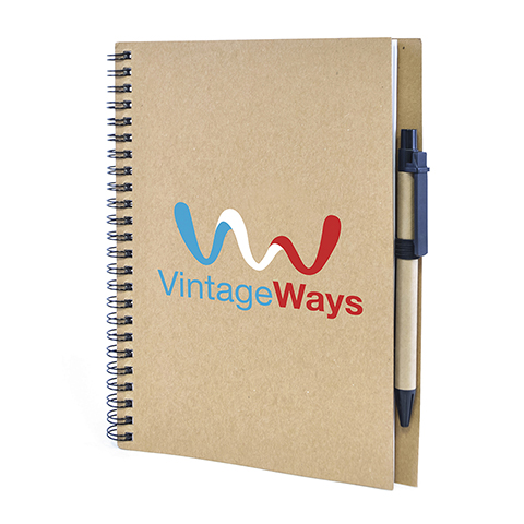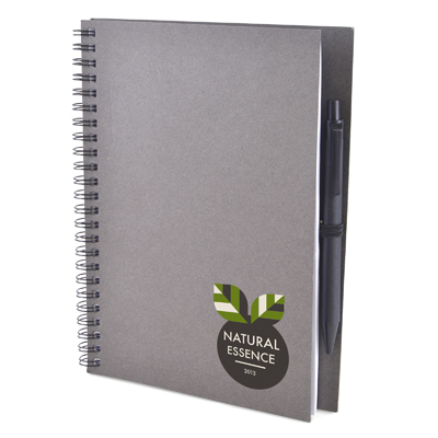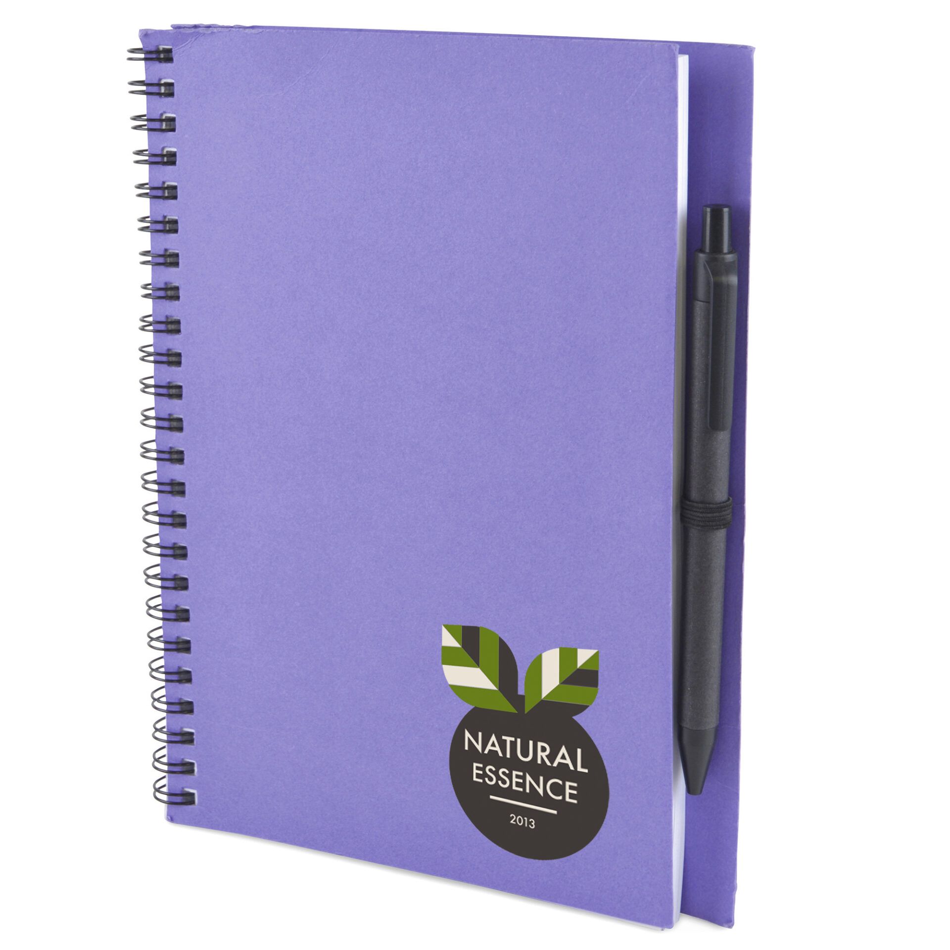 A5 Recycled wiro bound notepad with pen. Available in 8 colours
