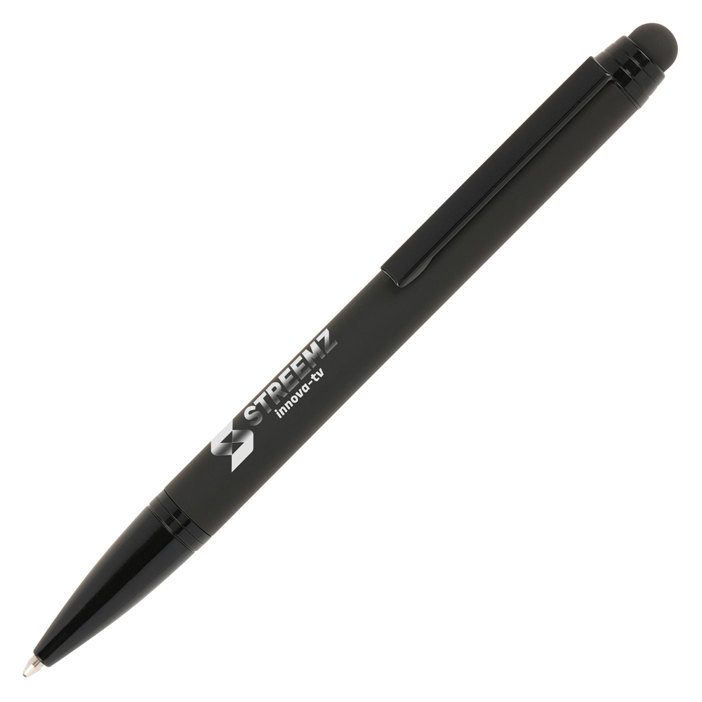 Give your brand a promotional boost with our premium Jet Black Soft Feel Stylus ball pen, a versatile writing instrument that exudes sophistication. Crafted with a sleek soft feel stainless steel barrel and equipped with a handy rubber stylus for effortless touchscreen interaction, this pen seamlessly combines style with functionality. Its quality construction, featuring brass barrel ensures both durability and a luxurious feel. This pen can be easily customised with your company logo or message, creating a truly unique promotional item that represents your brand identity. With its premium look and practical features, this pen makes for an ideal giveaway at corporate events, trade shows, or as a token of appreciation for clients and employees. Order yours today!